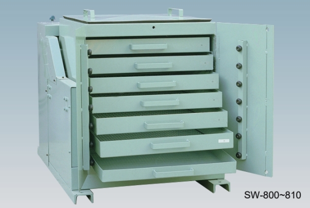 이 시험기는 콘크리트용 골재를 큰것부터 순서로 한벌의 체(6개)를 올려놓고 전동으로 흔들어서 골재를 크기별로 구분할때 쓰이는 기기이다.