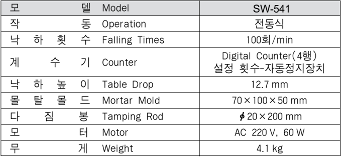 이 시험기는 전동식으로 수경성 시멘트 몰탈의 강도 시험용 시편 제작시 몰탈의 배합 주도를 결정하기 위한 기기이다. <관련규격:KS L 5111>