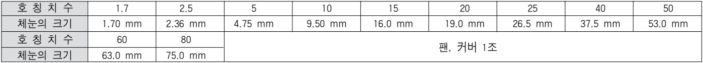 KS F 2508의 굵은 골재 마모시험 방법에 규정된 시료 조정용으로 필요한 것으로서 11종류의 체와 팬, 커버가 사용됨.