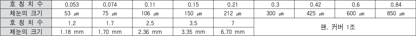 KS A 5302의 주물사 입도를 측정하는 시험방법에 규정된 시험을 하기 위하여 필요한 것으로 14 종류의 체와 팬, 커버가 사용됨.