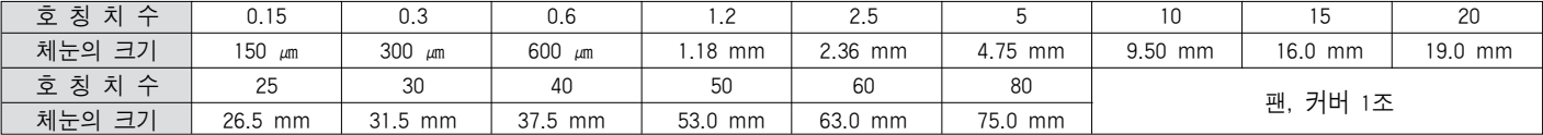 KS F 2507의 골재의 안정성 시험방법에 규정된 시험을 하기 위하여 필요한 것으로 15 종류의 체와 팬, 커버가 사용됨.