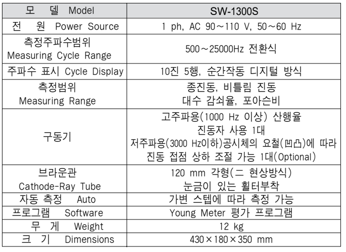 이 시험기는 기존 HS-1300 개량형 제품으로서 더욱 정밀하고 자동 측정기능이 추가되었다. 또한 Young율 프로그램이 있으므로 Young Metor의 측정 데이터를 컴퓨터로 수신해 공명법 비피괴 시험 데이터를 평가 및 기록하는데 상당히 편리한 장비이다.