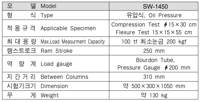 이 시험기는 콘크리트 공시체의 압축강도를 시험하는데 주로 사용한다. 각종 가압장치를 부착하여 공시체의 휨시험, 블럭및 벽돌, 경계석 등 여러 형태로 시험할 수 있으며 구조가 간단하고 편리한 기기이다. <관련규격:KS L 5105 KS F 2405>