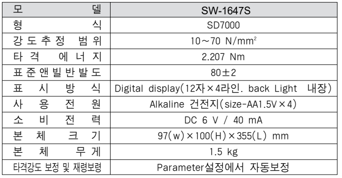 이 측정기는 비파괴 압축강도 추정 값을 내장된 프로그램에 의하여 자동으로 계산되어 표시창에서 볼 수 있으며, 측정된 Data는 SD Memory Card에 자동저장되며 타격 각도 및 재령보정이 Parameter 설정 으로 자동 보정된다. Job Name 입력기능으로 측정위치 및 측정번호 파 일저장관리가 용이하다. SD Memory Card에 저장된 측정 Data File을 불러서 확인할 수 있는 기능이 있다. Excel 호환용 소프트웨어와 함께 Data 처리 및 관리와 신속한 보고서작성을 할 수 있는 기기이다.
