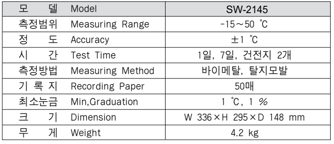 1일 측정, 7일 측정의 날자 변경은 전환 레버로 교환 측정되며 전환 스위치를 키면 즉시 작동하고 기록지가 감긴 원통도 밖으로 꺼낼 수 있다. 이 자기 온습도계는 온도 및 습도의 변화가 동시에 기록측정이 되며, 온도감지는 바이메탈, 습도의 감지는 모발을 사용한다. 회전하는 기록지에 시시각각 온습도가 기록되며 시간은 기어의 변경에 의해 1일 측 정, 7일 측정의 겸용으로 사용한다.