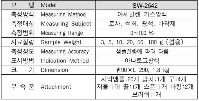 샘플에 함유된 수분과 칼슘 카바이트 시약이 반응시 발생하는 아세틸렌 가스의 압력을 측정하고 환산 그래프에 의해 수분을 구하는 수분계이다. 토사, 광석 등의 분립체에 포함되어 있는 미량의 수분을 정확하게 측정 할 수 있다. 전원은 물론 가열장치도 필요없다. 실험실이나 현장등에서 측정하기가 편리하다.