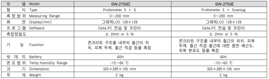 이 시험기는 콘크리트 내부에 묻혀져 있는 철근의 위치, 굵기 직경 및 콘크리트의 피복의 두께를 자기 감응방식을 이용하여 정밀하게 측정하며 불량 피복 두께 탐색기능을 이용하면 넓은 지역도 설계도상 시방과 비교하여 신속 정밀하게 측정이 가능한 장비이다.
